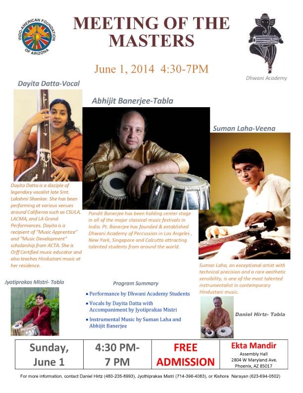 Meeting of the Masters by Daniel | Music | 0 comments Please join me for a free concert next Sunday at the Ekta Mandir temple in Phoenix. This will be quite an experience with a mix of students and masters of Indian music. I will be performing a piece with combining didgeridoo and tabla. See you there! Submit a Comment Cancel replyYour email address will not be published. Required fields are marked *Comment * Name * Email * Website Save my name, email, and website in this browser for the next time I comment. Sign me up for the newsletter!